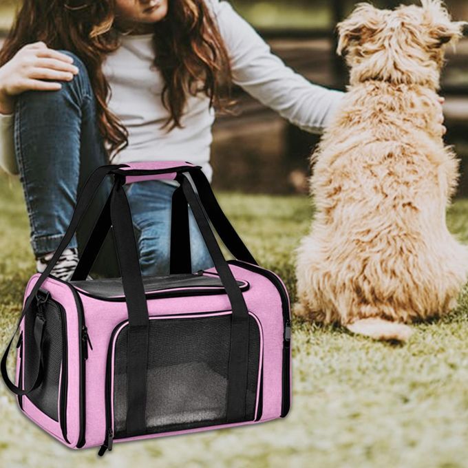 This pet carrier with two handles and a shoulder strap, you can take your pet to travel.