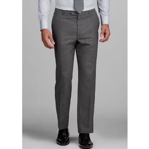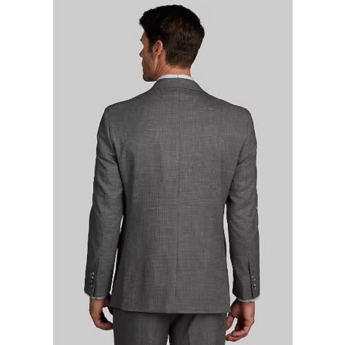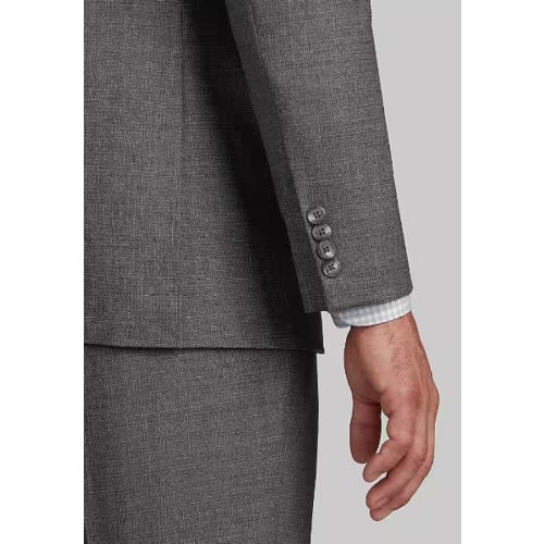 Perfectly pairing performance with style, this handsomely tailored Traveler suit features a unique fabric technology that maintains the optimum microclimate for your body. it removes moisture at the vapor stage before sweat can form. 37.5 acts like a thermostat by removing moisture when you are hot and retaining warmth when cold. It absorbs and traps odor molecules that are washed away when cleaned. Notch lapel, two button, side vents. Fully lined jacket, flat-front pants are lined to the knee and have an unfinished hem. 70% wool, 27% polyester, 3% spandex. Dry clean only. Jacket 42 Regular |Pant 36 Waist