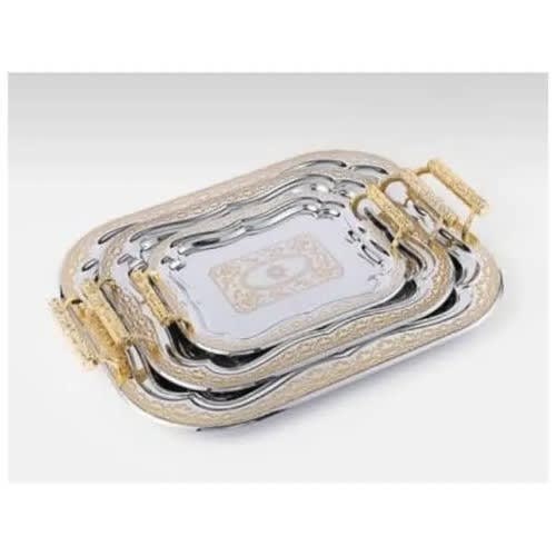 Unique lookStylish3 in 1 packSilver mixed with gold edgesQuality productAnti rust advantage. User ust ensure the tray stays dry at all times.This set of stylish stainless steel serving trays complements all decors of any home bar, commercial bar, wine cellar or kitchen. A gorgeous set with a shiny golden finish.