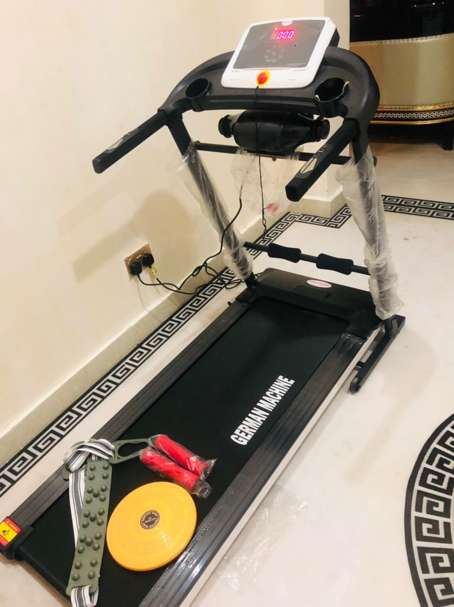 with massage dumbbells and sit-up LCD DISPLAYTime: 00: 00 -- 99:59 Min Distanace:0.00-99.99kmProgram: P1-P12Speed: 1.0-14KM/H Pulse: 40-199times/minuteCalories: 0-100%MotorBrushless 2 HP DC Walking area (L*W)1230*420mmRunning belt thickness1.8mmRunning Board Thickness16mmAllowable Weight100kgs