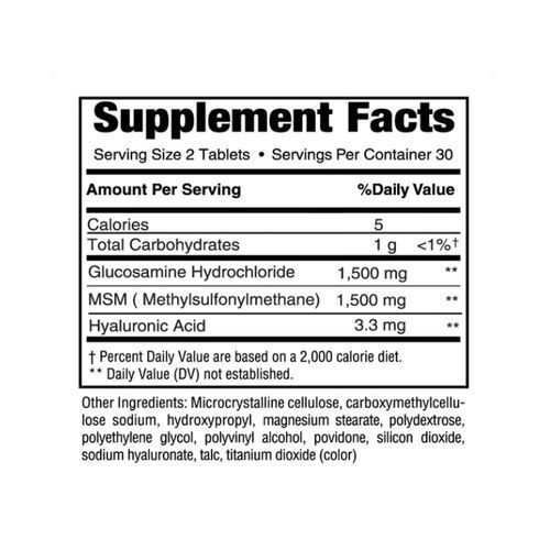 TOP REASONS TO SUPPLEMENT WITH GLUCOSAMINE MSM WITH HYALURONIC ACIDGlucosamine is a key ingredient for helping to cushion joints & nourish cartilage*Studies have shown that Glucosamine supports joint health and flexibility*MSM benefits overall joint health and normal range of motion*Hyaluronic Acid helps to maintain the fluid between your joints for comfort*Helps keep you active and pain free as it works to improve joint stress recovery time *SUPPLEMENT FACTS:DIRECTIONS: Adults, take two (2) tablets all at once with a meal, or take one (1) tablet twice daily with meals.