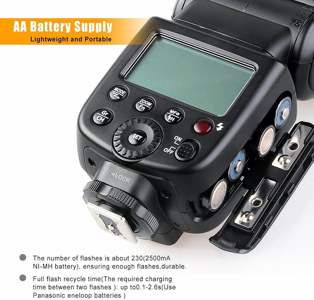 - The number of flashes is about 230(2500mA NI-MH battery). Full flash recycle time is up to 0.1-2.6s(Use Panasonic eneloop batteries)