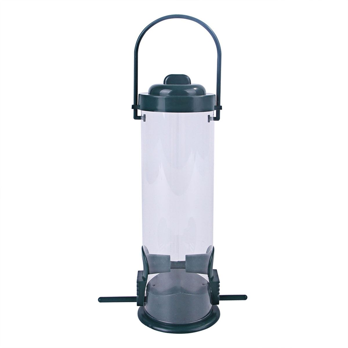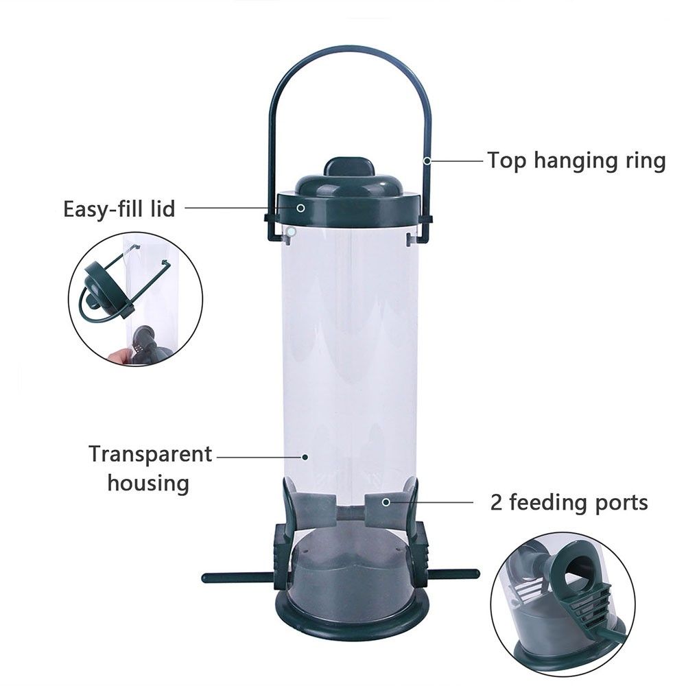 Tube-shaped hanging bird feeder, with high quality construction and practical function. 2 individual perches and reinforced seed ports. Quick, convenient cleaning and filling.