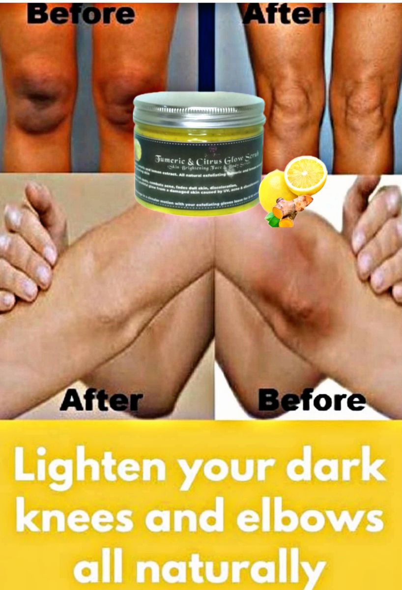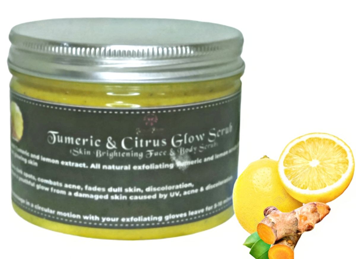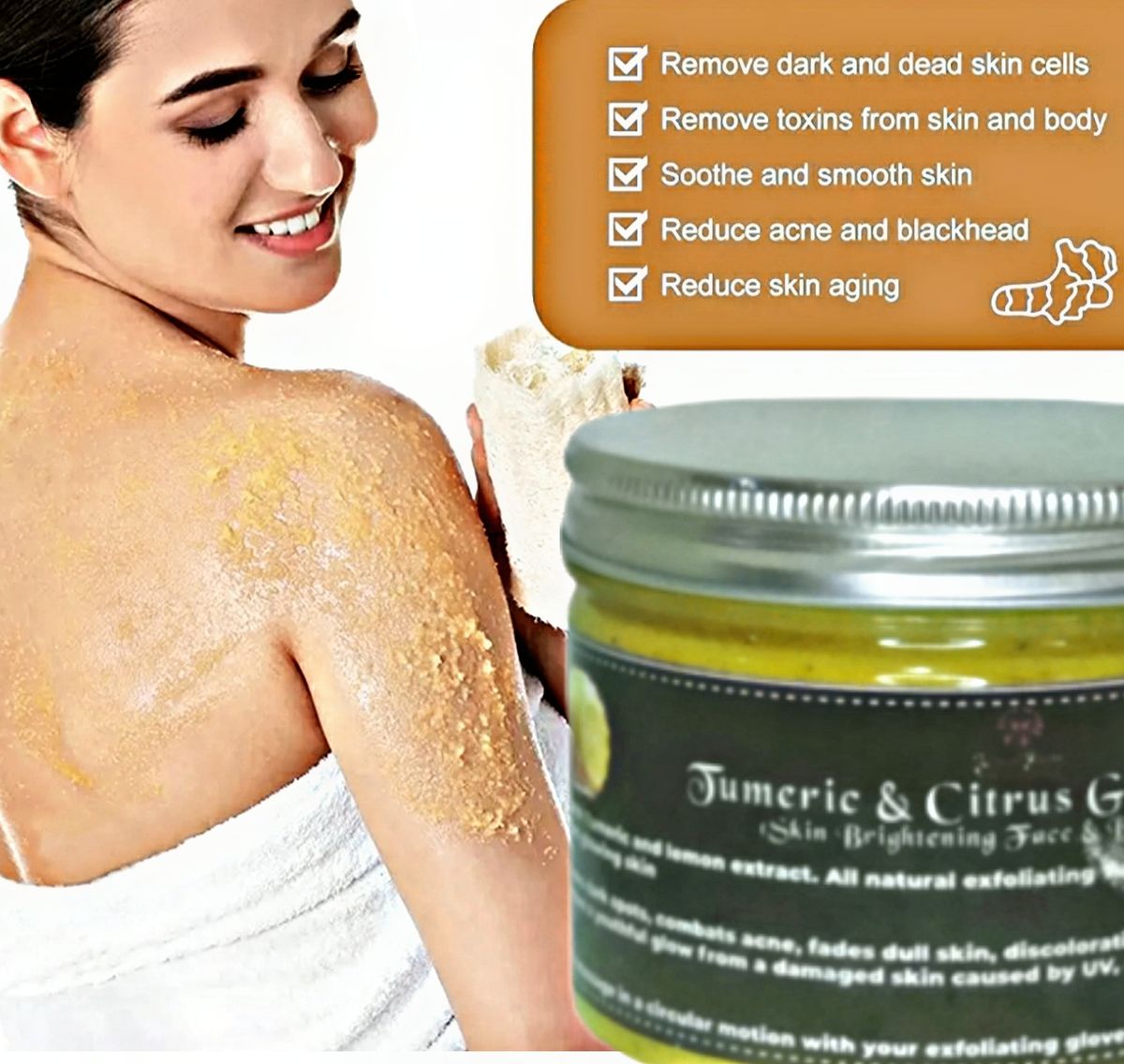 Tumeric is known to bring a natural glow to the body as well citrus. Brightens dark spots and combat aging skin. Your skin will feel very soft and refreshed after using this scrub! Say goodbye to dull dry skin and hello to your natural glow..