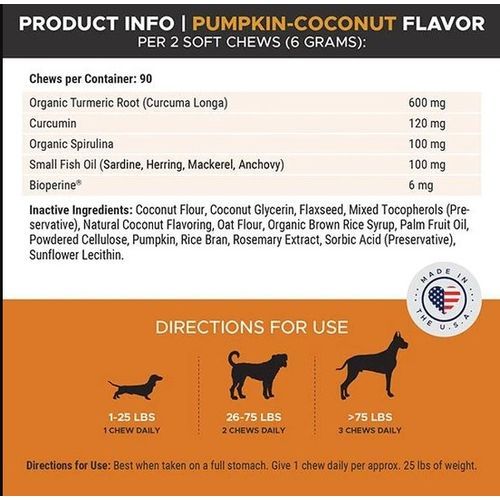 PetHonesty's Turmeric Joint Health soft chews are made in the U.S.A. with high quality all natural ingredients including Turmeric, Fish Oil, Flaxseed, Pumpkin, Coconut and BioPerine (a premium form of black pepper that helps dogs's bodies absorb Turmeric). Dogs love the taste of these treats which makes giving them a true reward while improving their health and quality of life.