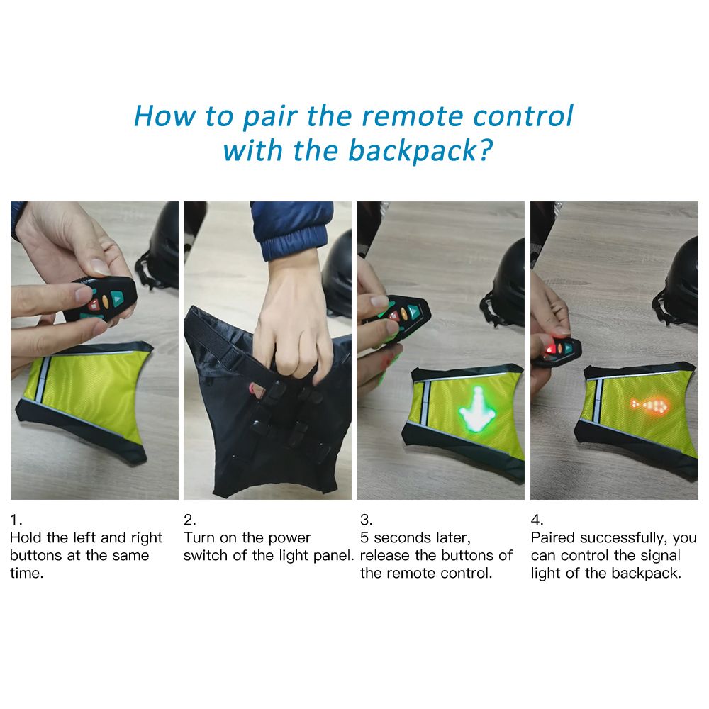 This remote controller is designed to send 4 signals to the reflective signal backpack / vest pack. It can be fixed on the bike handlebar for easier control.