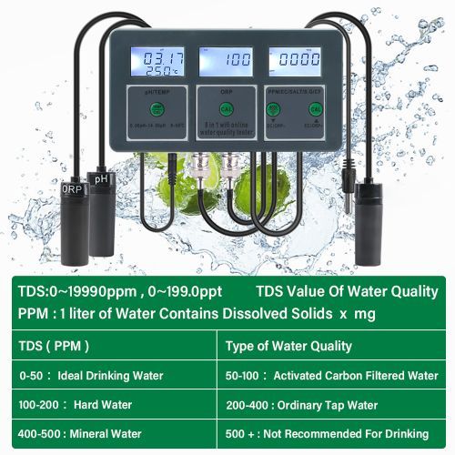 This is an 8-in-1 water quality tester, which can test the S.G/PH/EC/salinity/ORP/TDS/CF/temperature values of water. It is widely used in fishtanks, hydroponics and other occasions to provides fine aquatic environment for animals and plants.