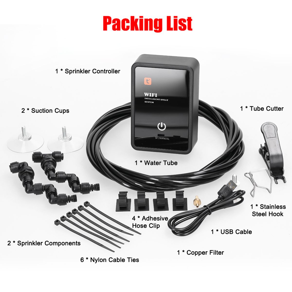 1 x Sprinkler Controller,1 x USB Cable,2 x Suction Cups,1 x Stainless Steel Hook,1 x Water Tube,1 x Copper Filter,2 x Sprinkler Component,4 x Adhesive Hose Clip,6 x Nylon Cable Ties,1 x Tube Cutter,1 x Instruction Manual