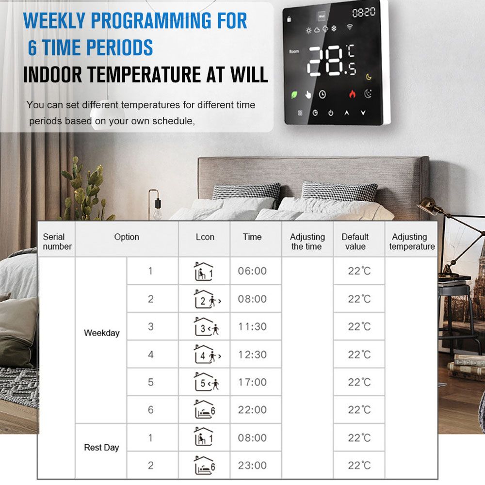 Weekly Programmable: Smartly programmed thermostat, the six time periods weekly programming mode allows you to set different temperatures for different time slots, maximizing the comfort and economy of your home environment.