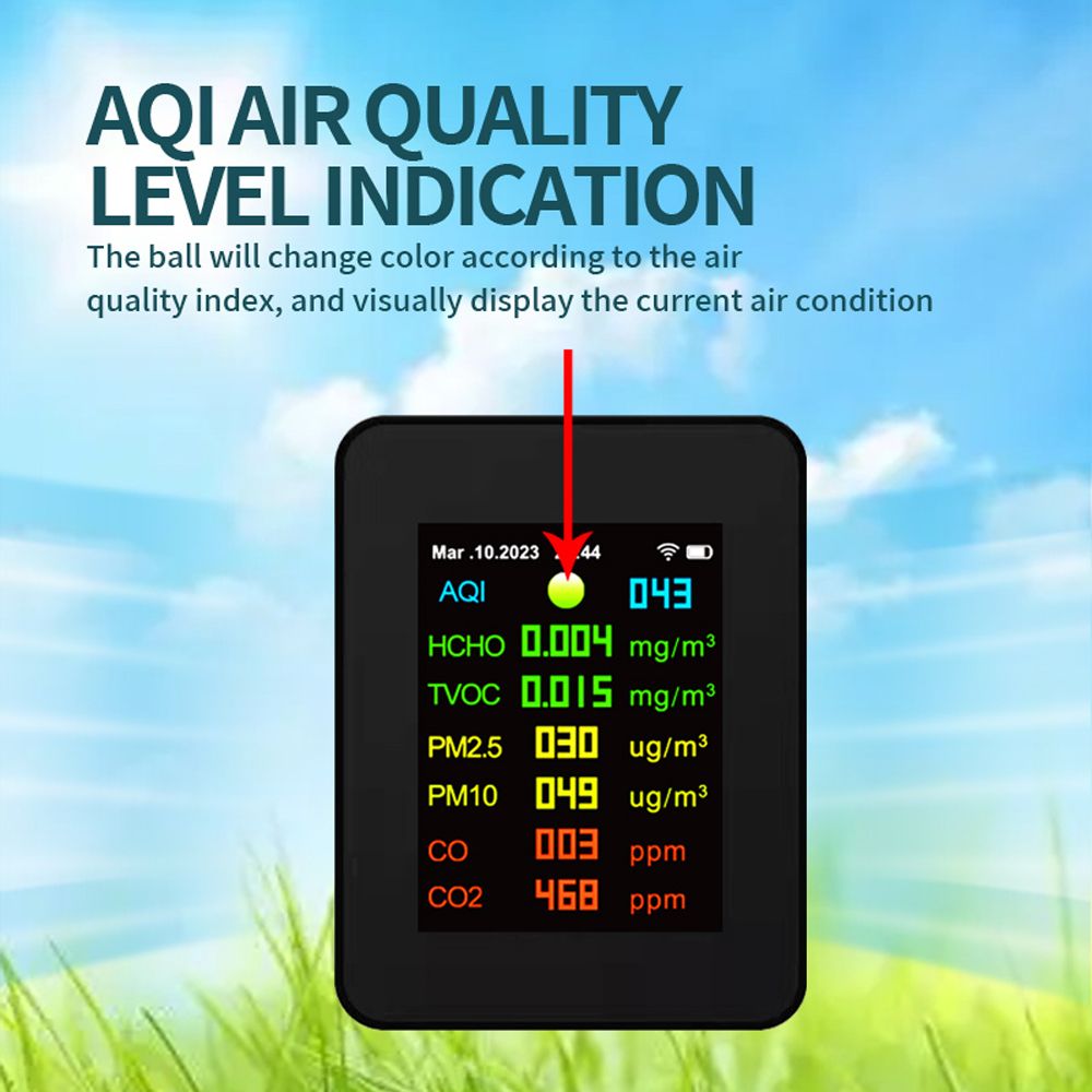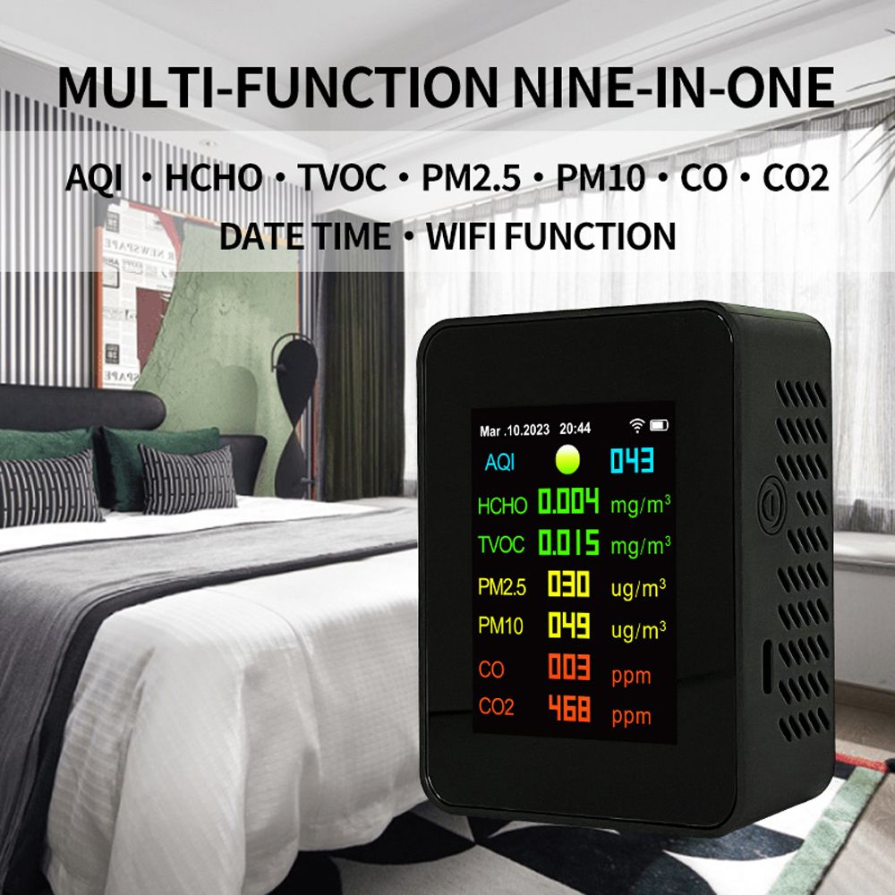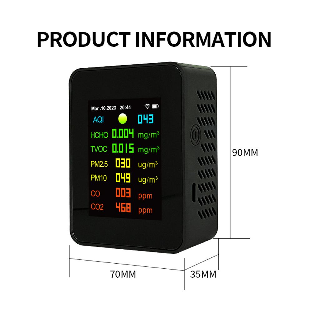 7in1 Air Quality Tester: This detector can be used to test and display PM2.5, PM10, carbonic oxide, carbon dioxide, TVOC, HCHO, and AQI at the same time. And also have time and date display and WiFi function.