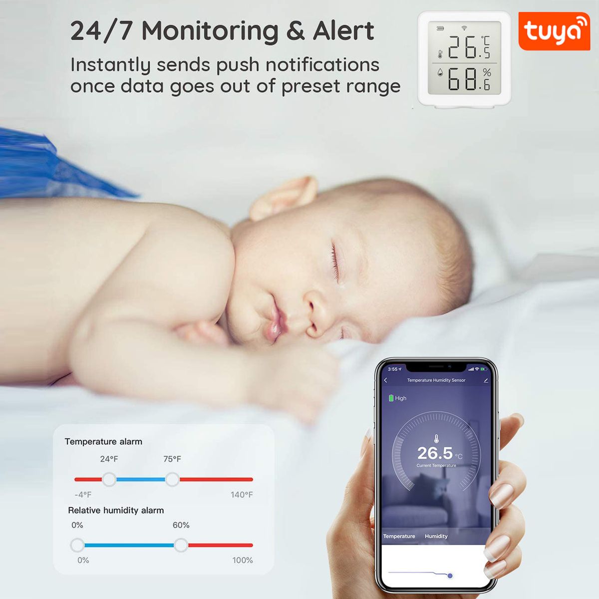 * Set the comfort zone via the Tuya APP and it will automatically alarm when the data of temperature or humidity are abnormal.