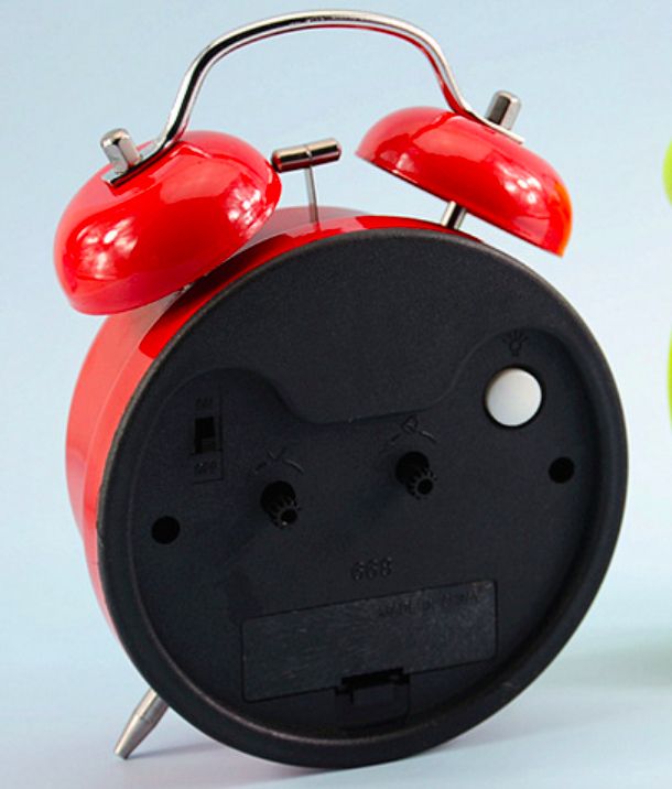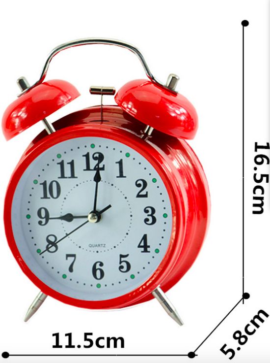 bell alarm clock, very suitable for people who snooze. Loud alarm clock for people who are heavy sleepers, No snooze button, good wake up clock for people who has trouble waking up.Almost mute scanning movement, just a little sound in the night ,but will not disturb your rest.Button for backlight: hold the light button, time will be clearly visible at night.Powered by: 1 x AA batteries (not included)