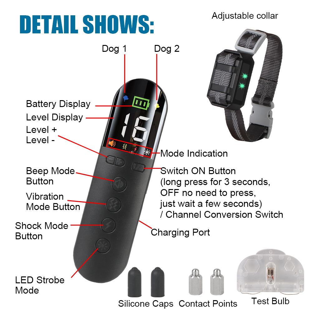 16 Power Level, You can adjust the strength to different kinds of dogs. Rank 1 to 16 levels are available with both Vibration Mode and Shock Mode, which are more on used during dog training course.