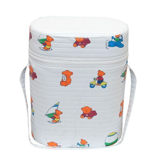 This is a two in one food warmer. It can accommodate two feeding bottles at a time. It has in it a vacuum flask that keeps the food warm. There is a zip round the warmer and a strap to hold it. It could serve a child from birth to one year.