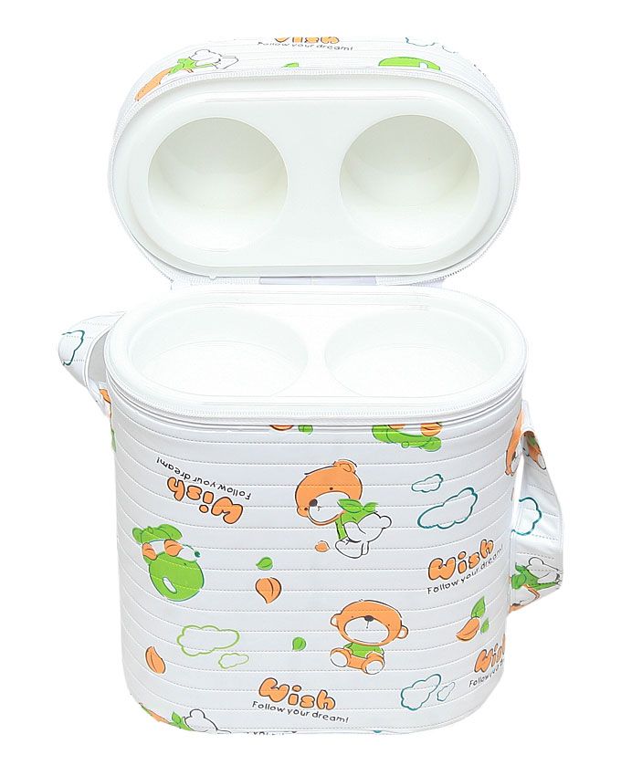 This is a two in one food warmer. It can accommodate two feeding bottles at a time. It has in it a vacuum flask that keeps the food warm. There is a zip round the warmer and a strap to hold it.It could serve a child from birth to one year.