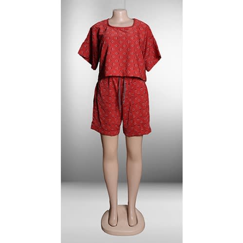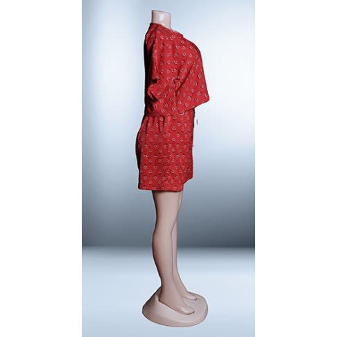 Comfortable set with flounce trim at front and a turn down collar dress, and bike shorts. Knee-length shorts with a wide jersey waist panel for best fit.