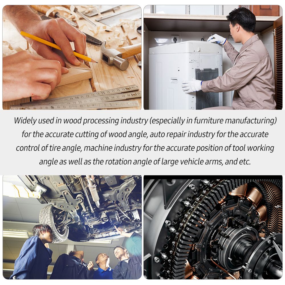Widely used in wood processing industry (especially in furniture manufacturing) for the accurate cutting of wood angle, auto repair industry for the accurate control of tire angle, machine industry for the accurate position of tool working angle as well as the rotation angle of large vehicle arms, and etc.