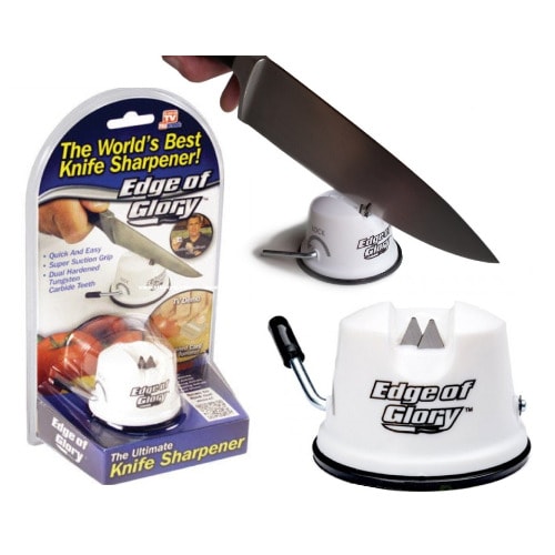Get the Bavarian Edge--the world's best knife sharpener--and all your knives will cut like new again. It features 2 independent spring-action arms that hone, sharpen or polish knives in seconds. Works on smooth or serrated knives. Made of durable, yet flexible tungsten carbide that contours to any blade or angle. No more dull or damaged blades. 4-5/8"W x 3"D x 6-1/2"H. Metal.