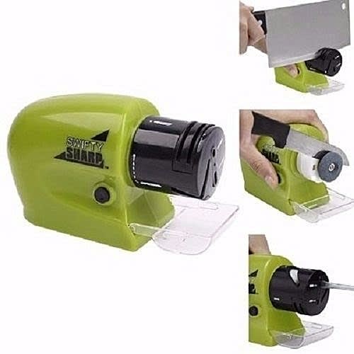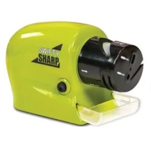 The incredible new cordless, motorized blade sharpener! Swiftly sharp is a cordless electric knife sharpener to give you precision sharpening for all your knives and tools? It has a professional-grade sapphire stone, which will hone it at the perfect angle and will make any blade razor sharp in just seconds.