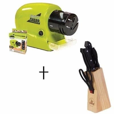 The incredible new cordless, motorized blade sharpener! + This beautiful 8-piece knife set will complement your cutting needs. Do everything needed to be done with a knife including Chopping vegetables, slicing turkey, boning fish, skinning oranges, and slicing hearty pieces of rustic bread with a different tool catered to each task. This Swifty Sharp is a cordless electric knife sharpener to give you precision sharpening for all your knives and tools. It has a professional-grade sapphire stone, which will hone it at the perfect angle and will make any blade razor sharp in just seconds. The Swifty Sharp offers precision power sharpening at a fraction of the price - and it's cordless, making your sharpening as convenient as ever.The knives can always be neatly stored in the accompanying rack.Buy this products and get good value for your money..
