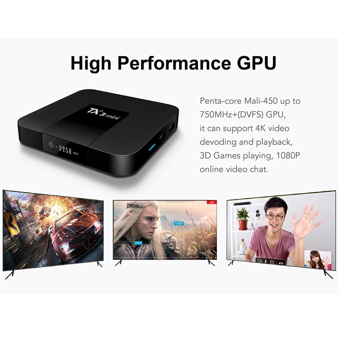 2. GPU: Mali-450 penta-core, up to 750MHz+(DVFS).