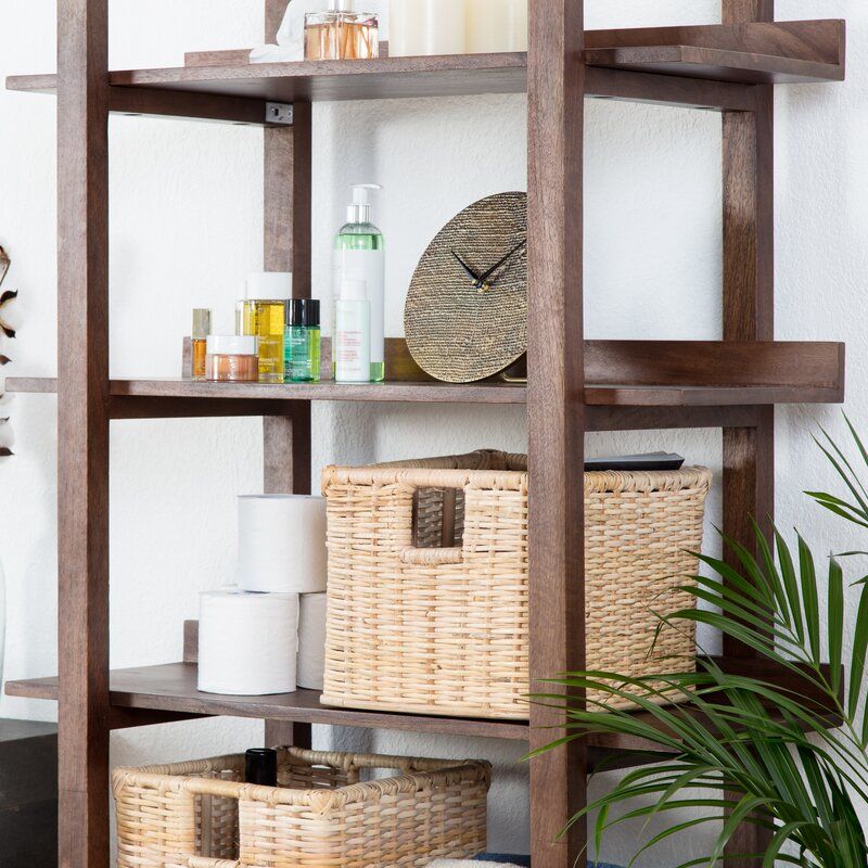 Small space? No problem. Just add this open bookcase, and in no time you'll have some extra storage space that doesn't leave a large footprint. The frame is made from engineered wood and features four straight legs that leave the sides open for a modern silhouette. Five solid walnut wood shelves offer plenty of space for living room, kitchen, bathroom, or bedroom essentials. The shelves are 12" deep, so you'll have plenty of space for small baskets and books. Assembly required.