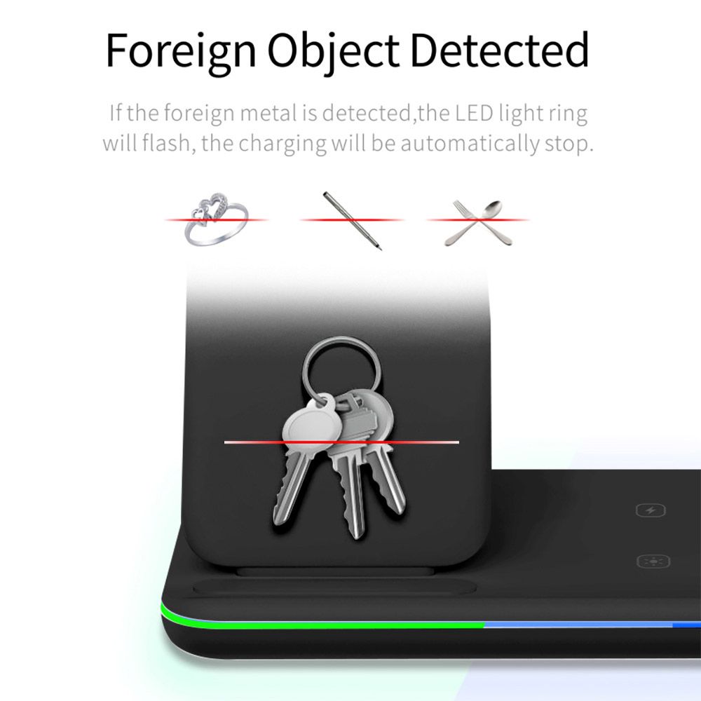 NOTE: Not suitable for apple watch 7 Series Feature 【3 in 1 Wirele Charger Design】3 in 1 wirele charging station can charge your phone/Watch/Headset at the same time, Multi-function design provides you a tidy charging stand. The 3 in 1 wirele charger only needs 1 charging cable will make your room or desk look more simple and neat, so your life would be more convenience. 【Secure Fast Wirele Charger Station】The wirele fast charging pad supports all phone Qi-enabled devices, 15W For Huawei P30 Pro, Mate 20 Pro, Mate 20 RS Porsche, Mate RS Porsche; 10W For Samsung Galaxy S10/S10+/S10e/S9/Note9/S8/S7; 7.5W For iPhone 11/11Pro/Xs Max/Xs/XR/X/8/8 Plus; 5W For stand charger and any Qi-enabled devices. The wirele charging station For Apple Watch series SE/6/5/4/3/2 For AirPods 2 Pro and other TWS Bluetooth cases, with over-voltage protection and temperature control. Specifications Material:PC+ABS Input: 9V/2.7A, 12V/2A (max) Phone Wirele Charging Output: 15W-10W-7.5W-5W Headset Charging Output: 3W Watch Charging Output: 2W Charging Efficiency: ≥73% Charging Distance: