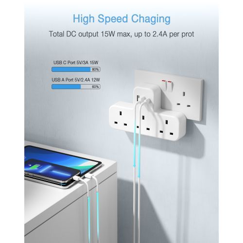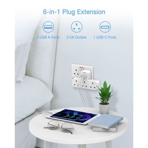 - Multi USB Plug: This multi plug adaptor features 3 AC outlets and 3 USB ports( 1 USB C Ports), ideal for charging indoors, without bulky extension leads. TESSAN triple multiple socket adapter which can use 6 devices simultaneously meets your daily needs.3AC outlets Max capacity up to 3250W (250V/13A) for High power appliances for kitchens, bathrooms.