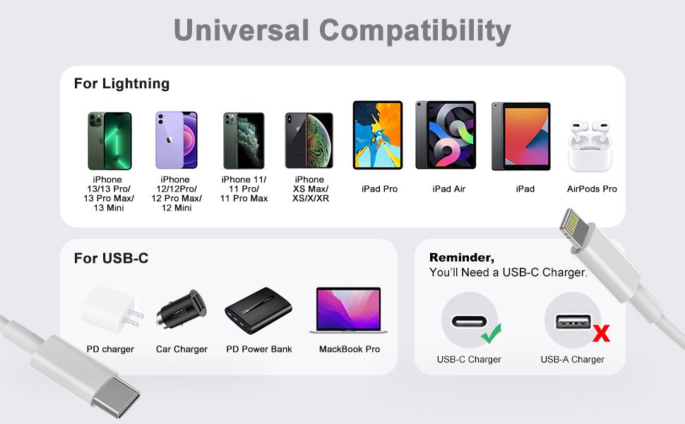 Fully Compatible Device with- iPhone 14/ 14 Plus /14 Pro /14 Pro Max, iPhone 13/ 13 Mini /13 Pro /13 Pro Max, iPhone 12/ 12 Mini /12 Pro /12 Pro Max, iphone 11 /11 Pro /11 Pro Max, iPhone XS Max /XS /XR /X /8 Plus /8, iPad Pro 12.9" gen1 /Pro 10.5"/ Pro 9.7" /Air3 10.5" /mini5 7.9" /mini6, iPhone 7 / 7 Plus / 6S / 6S Plus / 6 / 6 Plus / 5 / 5S / 5C / SE, iPad (4th, 5th, 6th, generation)/ mini / mini6 / mini5 /mini4 / 3 / 2 /Air / Air2.
