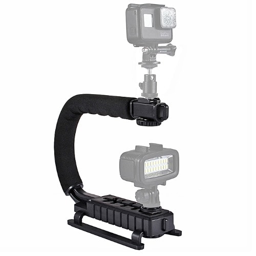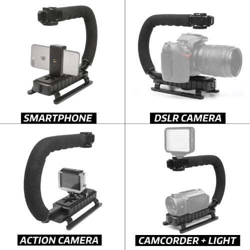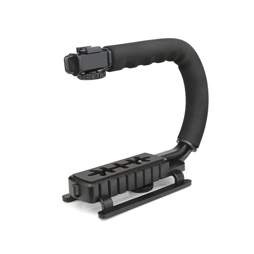 Features:Features a shock-proof rubber handle that alleviates stress by offering a comfortable, secure grip. C-shaped design makes the device more practical and it is great for multi-angles filming.Soft foam grip adds comfort and eases the long shooting fatigue.Professional U-grip allows you to hold your camera or Smartphone down low when filming skiing, snowboarding, skateboarding, etc.With sponge handle and non-slip feet, it is more stable.It can be used with most SLR cameras or camcorders.