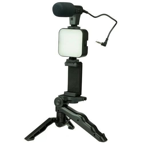 Vlogging kit is designed to enhanced your videos with better sound and lighting either indoor or outdoors, it includes a universal microphone, an LED light, a tripod grip, remote control and a smartphone adapter with built-in shoe