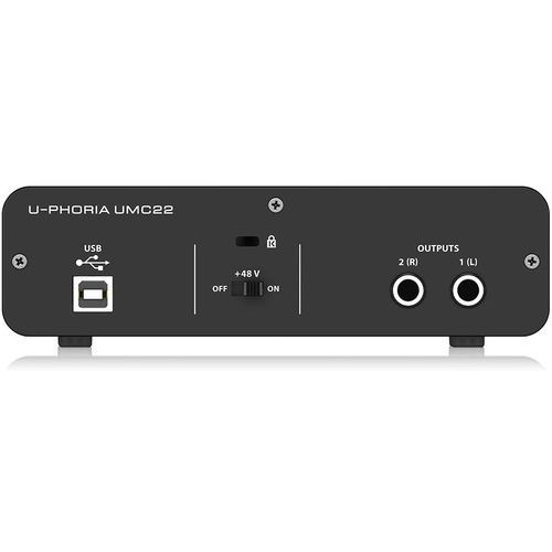 The U-PHORIA UMC22 2x2 USB Audio Interface from Behringer is a 2x2 audio interface that is capable of tracking your audio with sampling rates up to 48 kHz. It features a single Midas-designed combo XLR/TRS microphone preamplifier with selectable 48-volt phantom power. Additionally, the UMC22 has a front-panel 1/4" instrument input. Its I/O is rounded up by 2 rear-panel 1/4" outputs and a front-panel 1/4" headphone output.