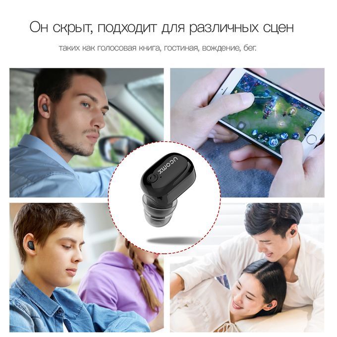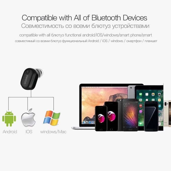 Other Bluetooth Earphone/Headphones/Headset Optional Good News!!! Follow our store to become fans, you can enjoy more favorable prices! UCOMX U6P Wireless Earbud Auriculares Bluetooth Earphone Hidden Single Ear Phone Earpiece with Microphone for iPhone Samsung Specifications: - Bluetooth Version: V4.2 - Profile Supported: Headset / handsfree / A2DP / AVRCP - Size: 27*19*27.5mm - Charge Voltage: DC 4.8-6.0V - Playing Time: 4 hours - Talking Time: 4 hours - Standby Time: 120 hours - Charging Time: 2 hours - Battery capacity: 200mAh - Charging for earphone: 3 times - Charging time: 2 hours Easy pairing 1. In the off state, long press the MFB button for 5 seconds until the red and green LEDs flash. 2. Turn on your bluetooth and search for the device "Bluetooth 6P". 3. Connect and enjoy! Package List: - 1 x U6P Bluetooth earphone - 1 x Micro USB charging cable - 1 x 200mAh Charging dock - 2 x Earcaps - 1 x User manual - 1 x Retail box Questions&Answers: Q:How do you pair this device? A:You have to hold the button till the red blue light flashes alternately for about 5-6secs,then you need open bluetooth can pair it. Q:Can two be paired? A:Two different phones or tablets can be paired. But 2 same earbuds can not be paired on same one device.