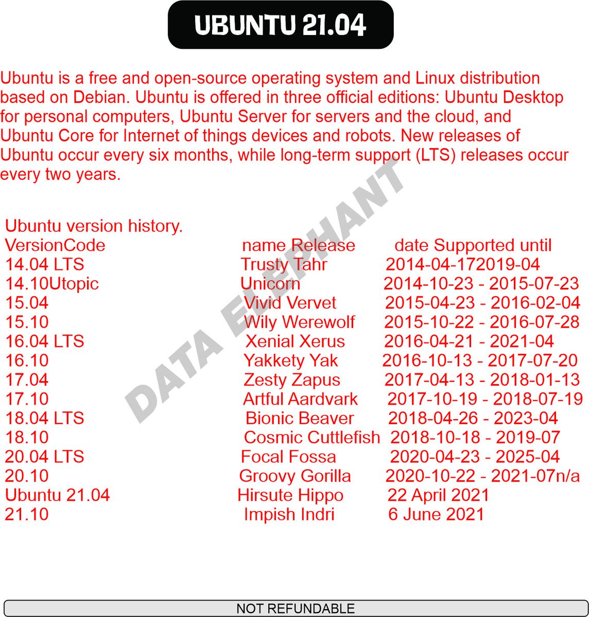 Ubuntu is a free and open-source operating system and Linux distributionbased on Debian. Ubuntu is offered in three official editions: Ubuntu Desktopfor personal computers, Ubuntu Server for servers and the cloud, andUbuntu Core for Internet of things devices and robots. New releases ofUbuntu occur every six months, while long-term support (LTS) releases occurevery two years.