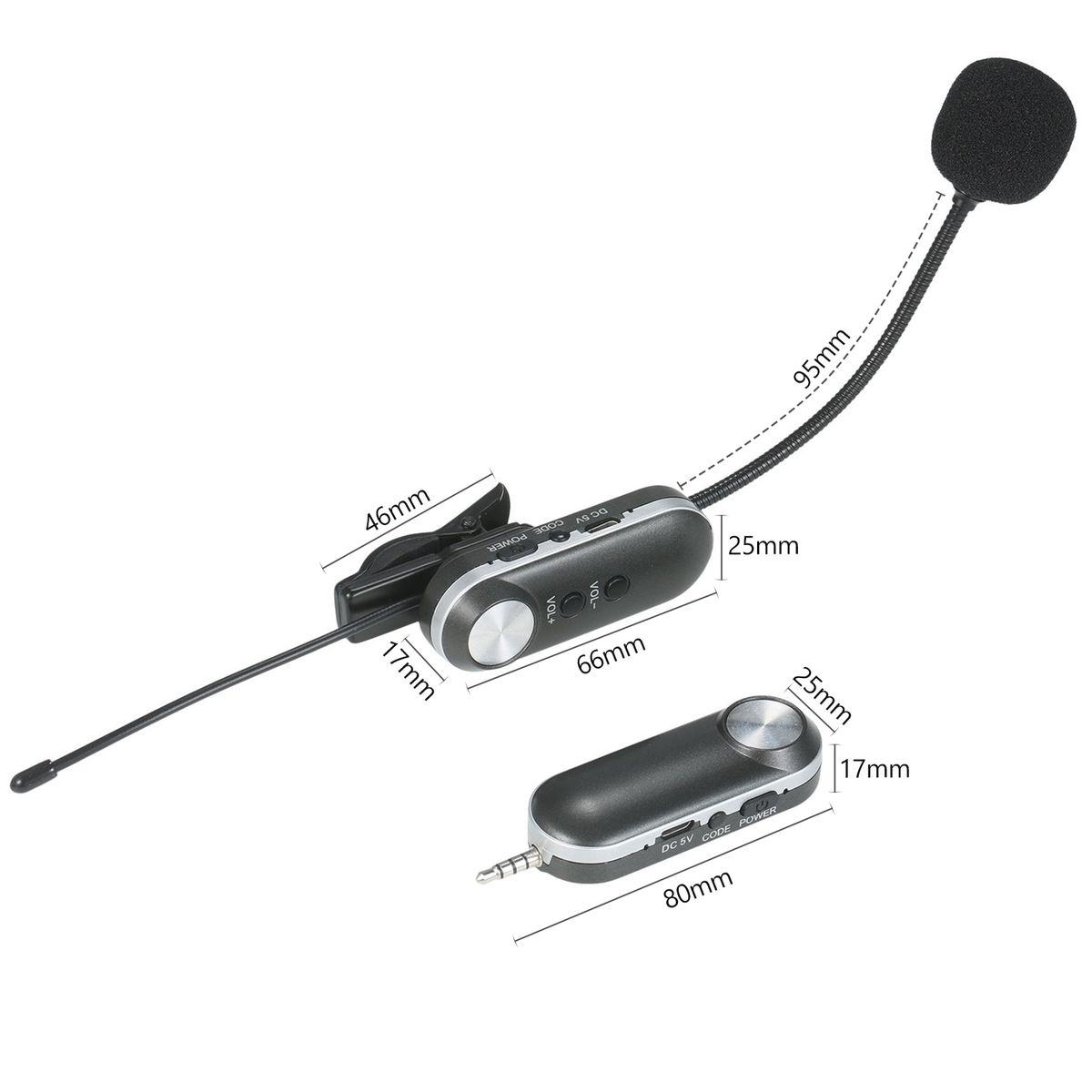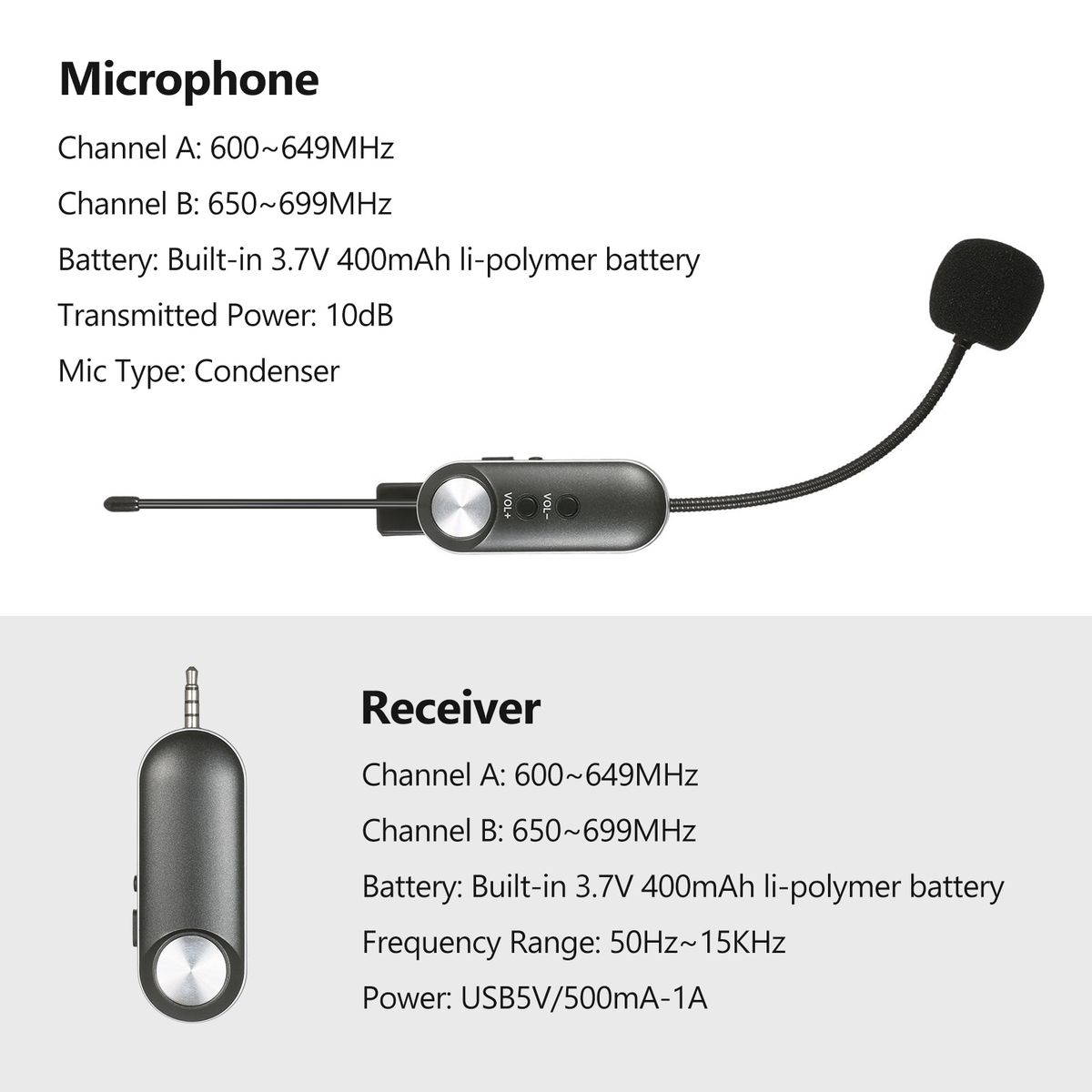 Features:Wireless Headset Microphone/Receiver: having low battery indication and low battery shutdown function. A/B channel will avoid the distraction of the same frequency by changing frequency when using the same frequency.