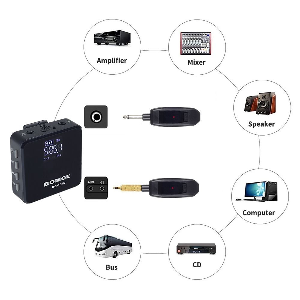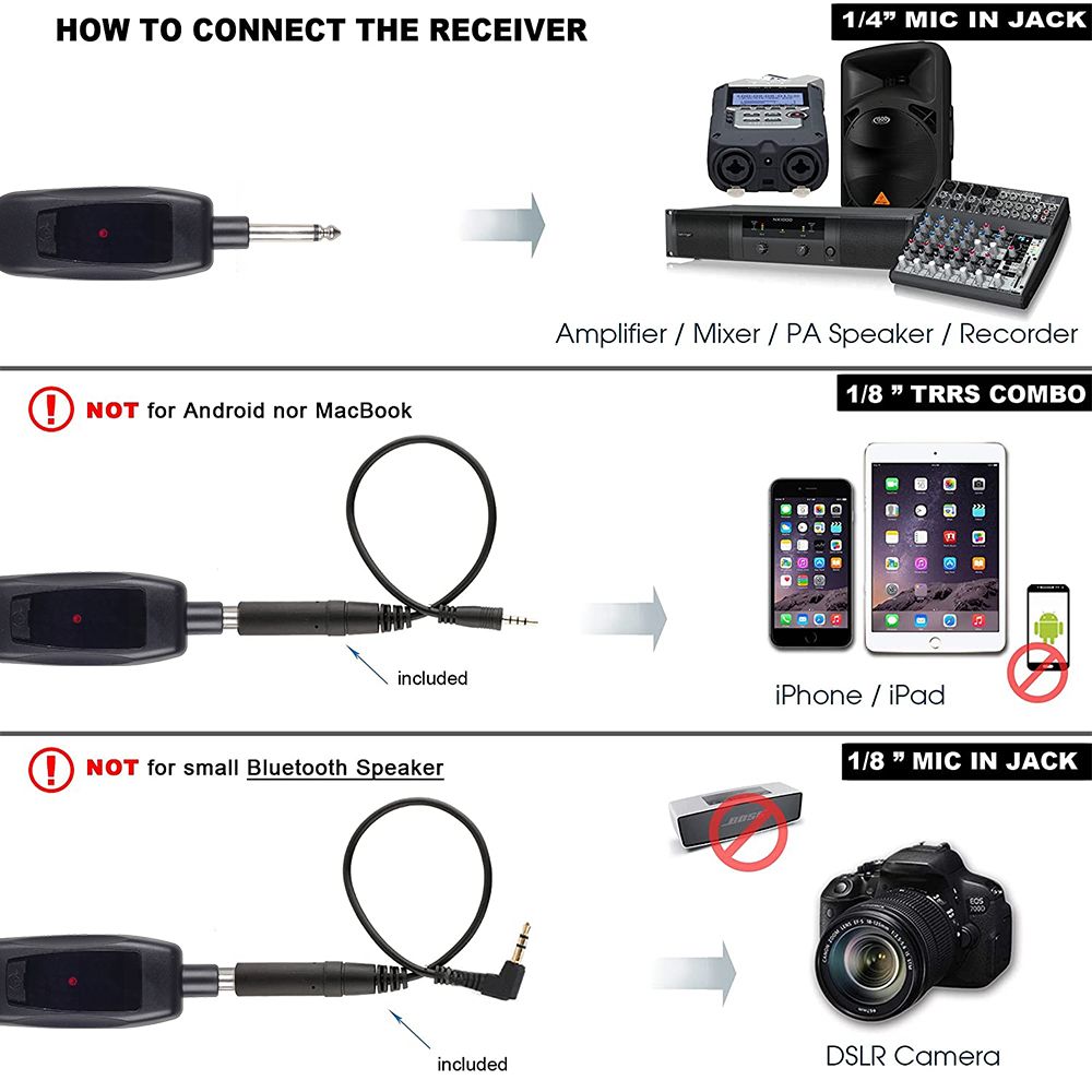 Wireless receiver with universal 1/4 plug, can be used with mixers, PA speakers, karaoke machines with 1/4 MIC IN for voice amplification, and phones, laptops, DSLR cameras for recording (with adapter). (Even with the adapter, it is not recommended to use the microphone on the phone).