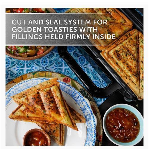 Cut and Seal System: Makes triangular sandwiches and browns toasties more evenly, with all the fillings sealed inside