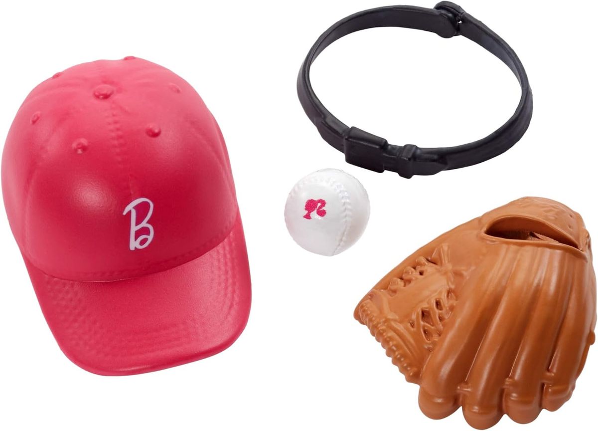 - baseball uniform in blue, white and pink with matching cleats, a black belt , a pink baseball cap with a Barbie "B." A baseball ball and a baseball mitt.