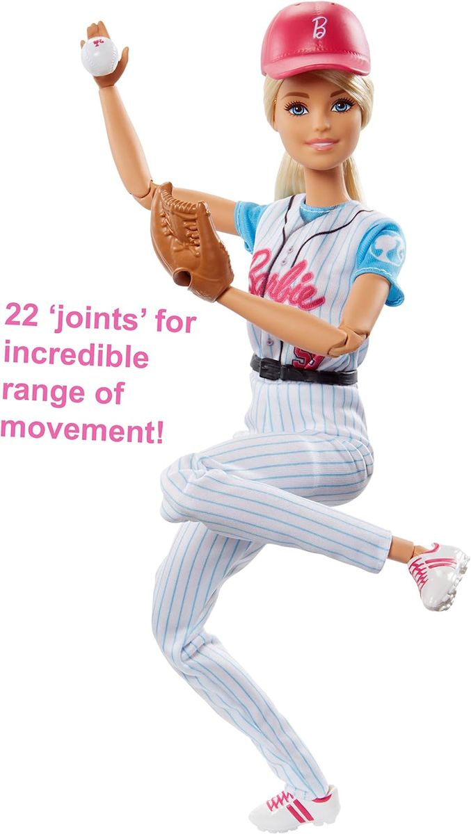 Explore Sporting Careers with Career-Themed Dolls Barbie doll has done it all -- what do you want to try? Try taking to the field -- the baseball field -- with Barbie baseball player doll. The sport requires skill, agility, coordination, speed and team spirit. Barbie baseball player doll wears her colors (blue, white and pink) with pride in a uniform with striped pants and baseball jersey noting her number (59). A pair of white cleats with pink stripes and a pink baseball cap match for a home run.