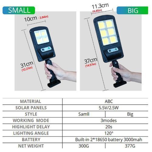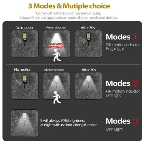 REMARK: Make sure that the sunlight is placed so that it is not in the shade during the day and the south facing is better. Charge the solar light for 6-8 hours in the sun before first use. Solar motion sensor light is an ideal choice for outdoor environment, such as fence, patio, deck, yard, garden, step and other outdoor locations. The description: - Wide application: IP65 outdoor solar lights, suitable for gardens, swimming pools, fences, yards, walkways, stairs, exterior walls, etc., heat, weather, no need to worry about exterior damage. - Automatically turn on: PIR motion sensor can scan the heat source which continuously moves within the detection range. When someone appears in the area, the light will automatically turn on. - Solar light: Solar light needs 6 hours of solar charge during the day and 10 hours of normal operation at night. No wires are needed, giving you an economical, low carbon and environmentally friendly life. - Fast charge: the solar panel charge depends on the duration of the light and weather conditions. The stronger the sun, the shorter the charging time. On cloudy or rainy days, battery efficiency is reduced, resulting in shorter lighting times. - Premium material: high quality lamp beads, a wide range of lighting, giving you excellent lighting. - Induction alarm function (only lights, no sound): the light will automatically turn on when someone enters the induction range at night Characteristics: Button illumination mode: - OFF: off mode, the indicator light is red; - First gear: some people arrive, light up strongly for 15 to 30 seconds, when no one turns off; - Second gear: some people arrive, very bright for 15 to 30 seconds, and when there is no one, the light is always bright and weak; - Third gear: it doesn't matter if no one is there, and the low light is always on. Charging time: 6 hours in the sun PIR detection angle: 120 ° Detection distance: 8-10 meters