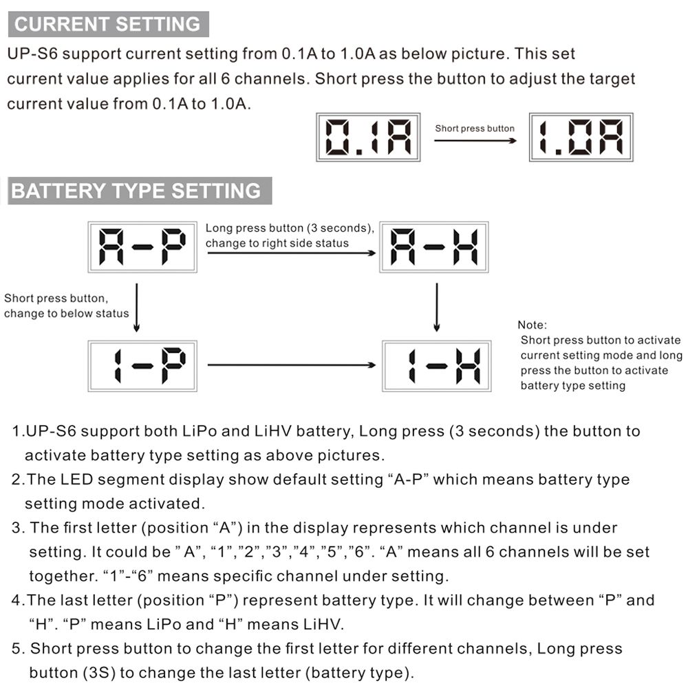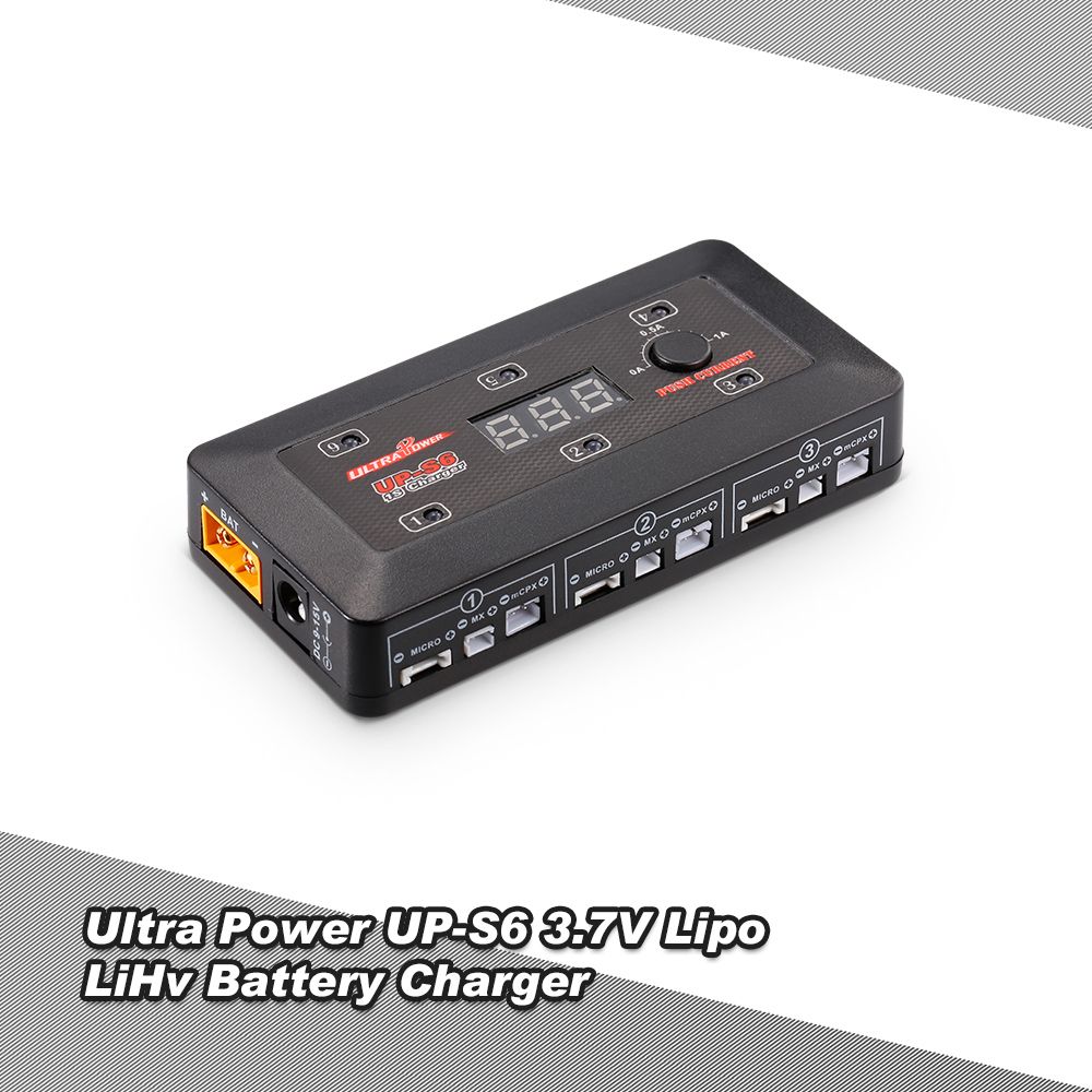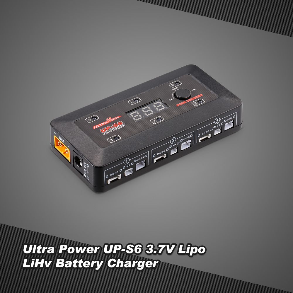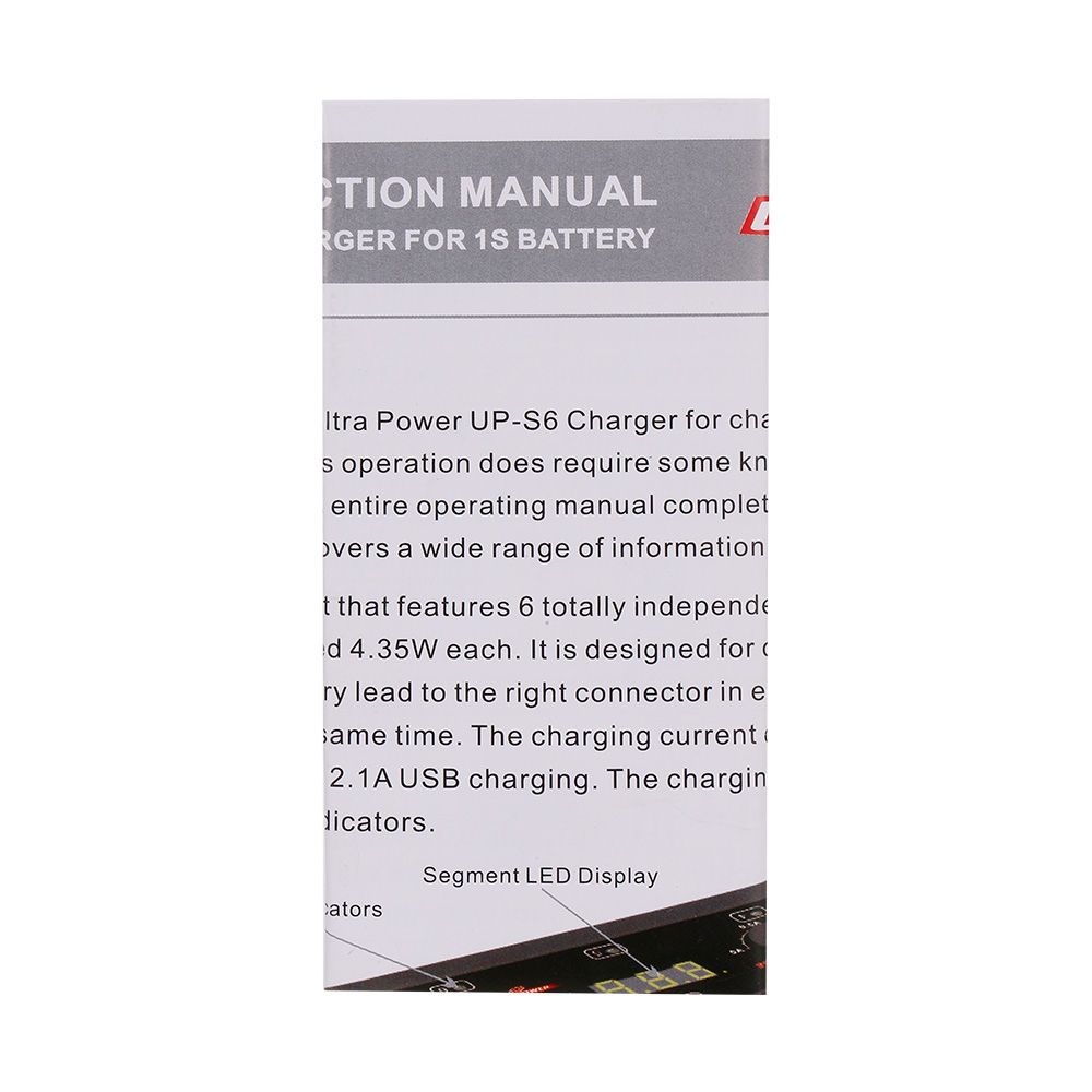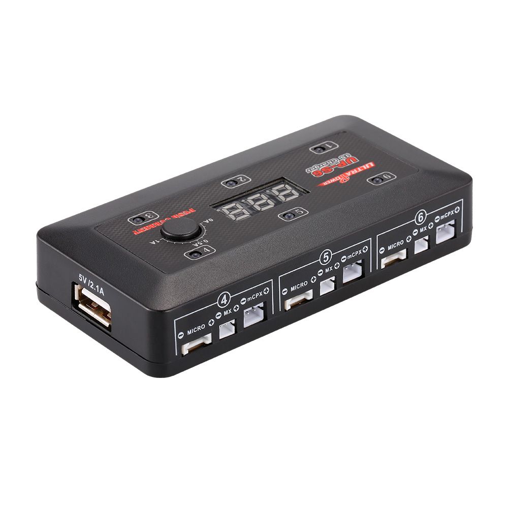 UP-S6 employs the circuit that features 6 totally independent but identical power outputs which are powered 4.35W each. It\'s designed for charging single cell Lipo and LiHV. Insert the battery lead to the right connect in each port, the charger can charge 6 batteries at the same time. The charging current can be adjustable from 0.1-1.0A and also support 5V, 2.1A USB charging. The charging status can be displayed in digital segment LED indicators.