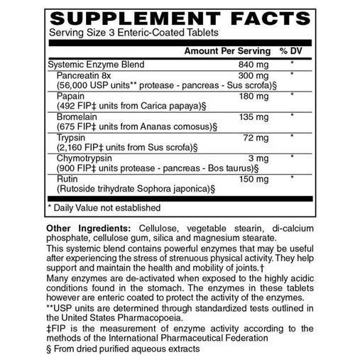 Ultra Proteo-Zimes™ is a systemic enzyme formulation that contains a unique blend of enzymes that have been clinically studied to support numerous biological processes.* This supplement combines a powerful combination of enzymes including - Pancreatin, Papain, Bromelain, Trypsin, Chymotrypsin, and Rutin. These enzymes are designed to be digested and absorbed in the small intestine and travel directly to the blood and are therefore not designed to assist in the digestive process itself; with the exception of some support of protein digestion. The enzymes in Ultra Proteo-Zimes TM help support healthy cardiovascular, immune and joint function as well help support tissue repair.* Recover faster with tissue repair benefits provided by our Ultra Proteo-Zimes. Once absorbed, these enzymes will aid in tissue recovery helping to break down specific protein molecules that may be directly involved in inflammation, poor circulation, pain, and stiffness.* Our enzyme helps support the breakdown of proteins in the intestinal tract, thereby aiding in the digestion and absorption of proteins.* As a Proteolytic Enzyme, it provides systemic enzyme support for healthy joints, particularly joint mobility; ensuring a normal, healthy response to inflammation throughout the body. Our Proteolytic Enzymes Supplement supports healthy circulation through its fibrinolytic action (breaking down fibrin which may cause excessive blood clotting) within the cardiovascular system.* Boost the immune system with our enzyme supplement by limiting the production of cytokines (molecules that cause inflammation).* *These statements have not been evaluated by the Food and Drug Administration. This product is not intended to diagnose, treat, cure or prevent any disease.TISSUE REPAIR: Our Ultra Proteo-Zimes, a proteolytic enzyme supports inflammation.Once absorbed, these enzymes will support tissue recovery.JOINT FUNCTION: As a Proteolytic Enzyme, it provides systemic enzyme support for joint relief.CARDIOVASCULAR SUPPORT: Our Proteolytic Enzymes Supplement supports healthy circulation within the cardiovascular system.IMMUNE SUPPORT: Our enzyme supplement supports the immune system.TRUSTED BRAND: Made in the USA, Non-GMO, Vegan, Gluten Free, Soy Free, Caffeine-Free, Lactose Free, KETO-friendly.