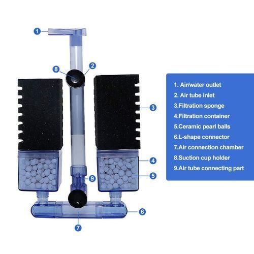 Sponge filter,Scientific 7-layer ribbing shape sponge design,Corner multi-layer filter,it quickly established a bio-filter, more surface area for beneficial bacterial to colonize and faster cycling,play a purifying water quality, and the oxygen port can rotate 360 degrees without dead ends,keep your fish tank crystal clear and clean.