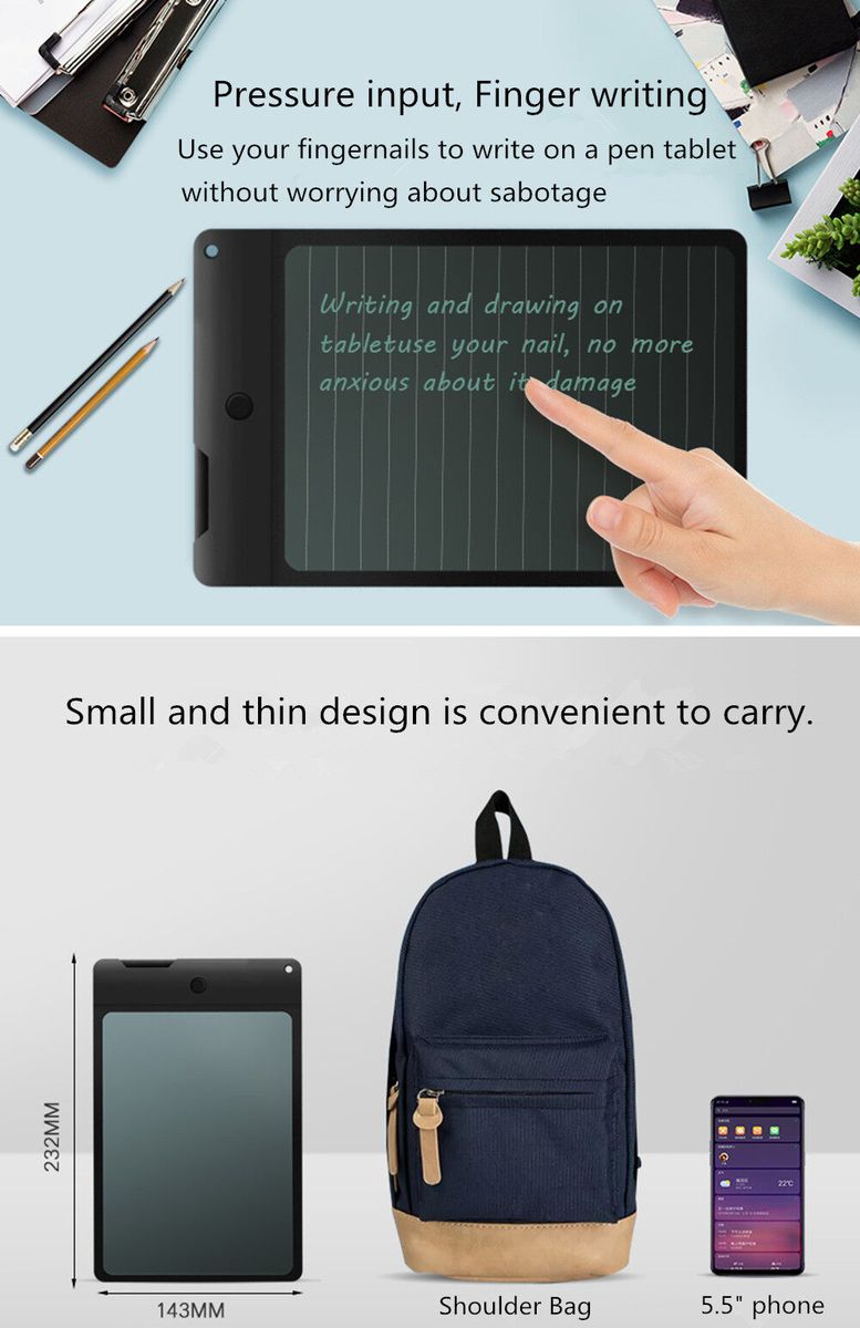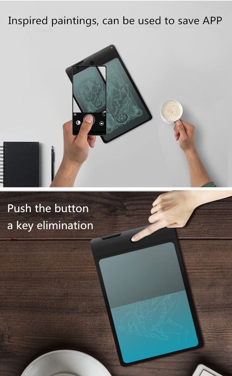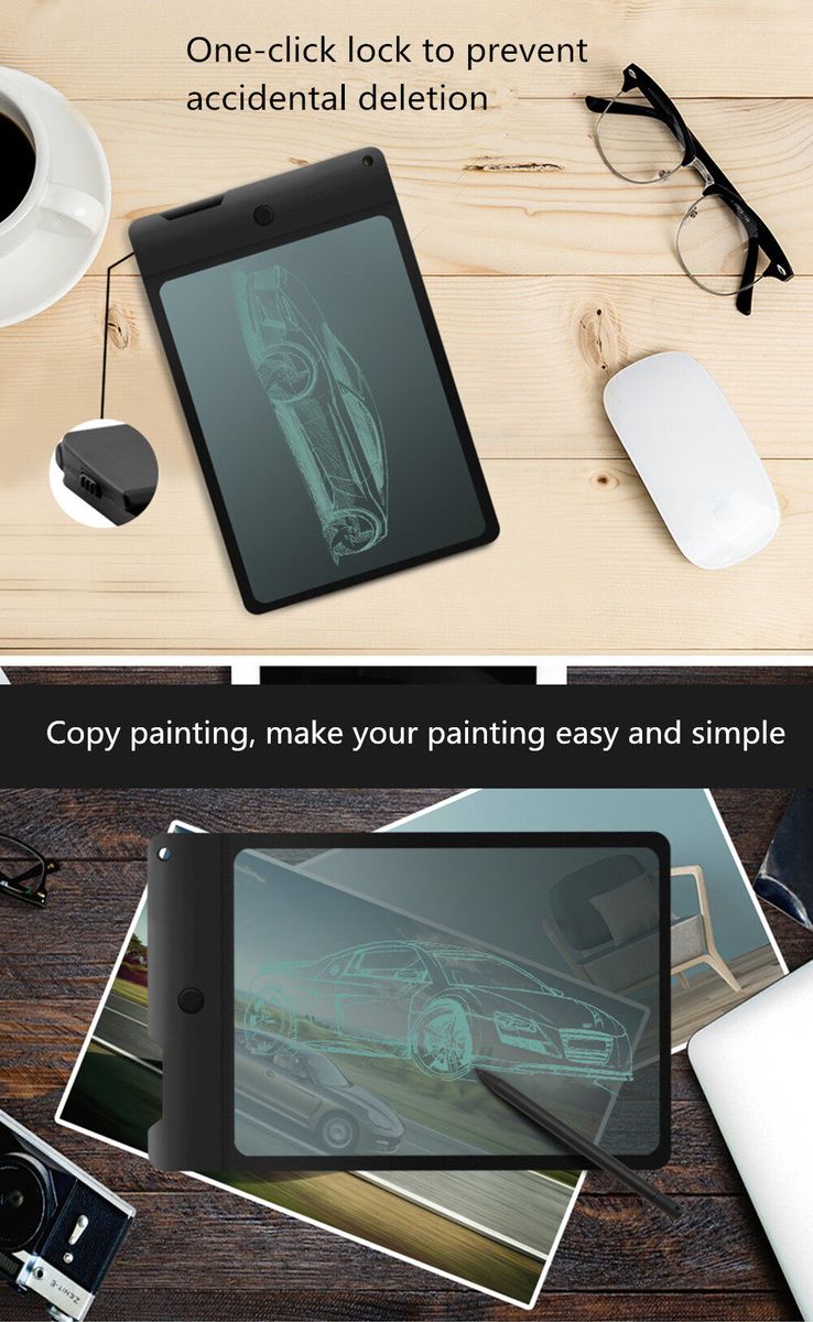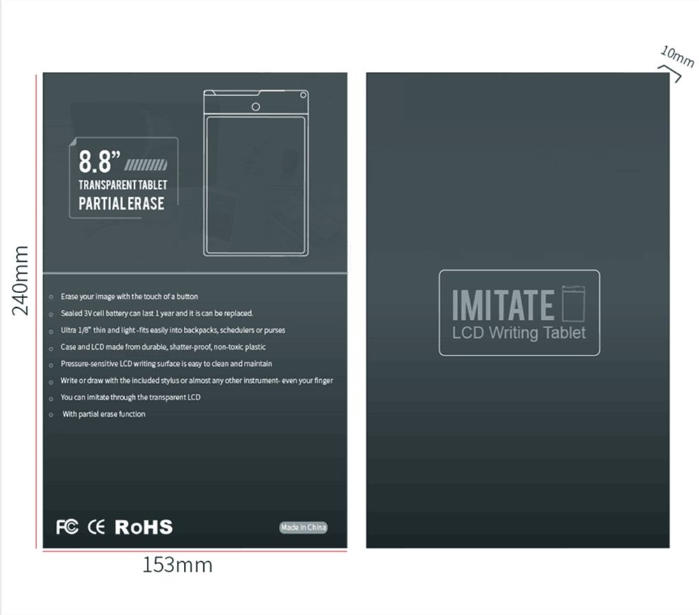 Erase your image with the touch of a button.Sealed 3V cell can last 1 year and it is can be replaced.Ultra 8 inch thin and light-fits easily into backpacks,schedulers or purses.Case and LCD made from durable,shattrt-proof,non-t0xic plastic.-sensitive LCD writing surface is easy to clean and maintain.Write or draw with the inclued stylus or almost any instrument-even your finger.You can writing through the transparent LCD.With partial erase function.