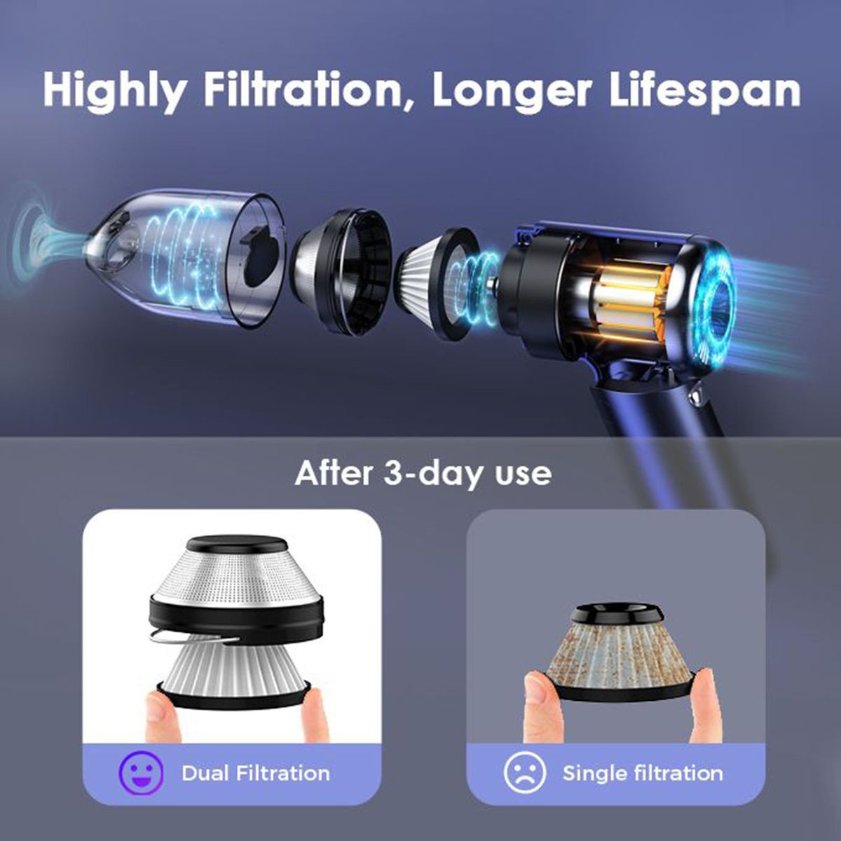 Unlike many hand vacuum cleaners with an only HEPA filter,this hand vacuum comes with a 2-stage filtration system. The Outer stainless filter of this small handheld vacuum could separate big dirt, and the inner Hepa filter could remove small dust and ashes. Both are easily detachable and washable, which make the lifespan of the vacuum even longer.
