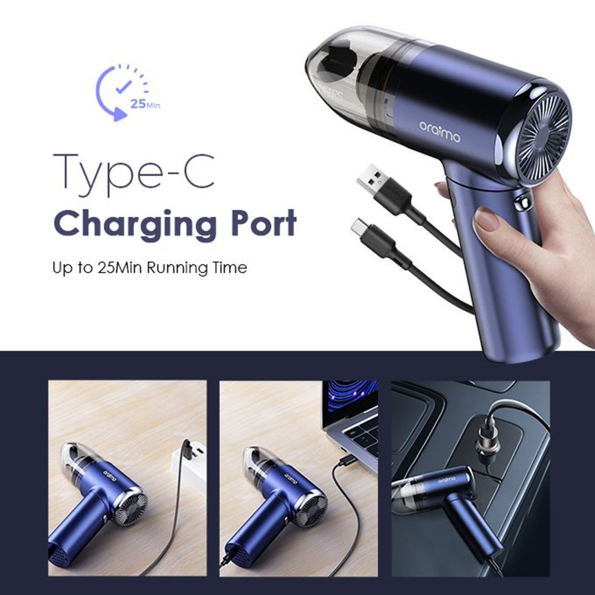 With its powerful motor, oraimo handheld vacuum cleaner cordless provides stable and super suction without the hassle of cables, which can easily suck up a smartphone. Compared with the common short run time, this handheld hoover runs over 20 mins with ease, it can be a reliable cleaning helper for you.