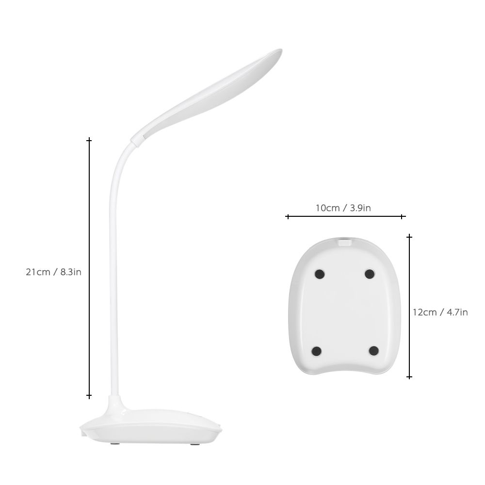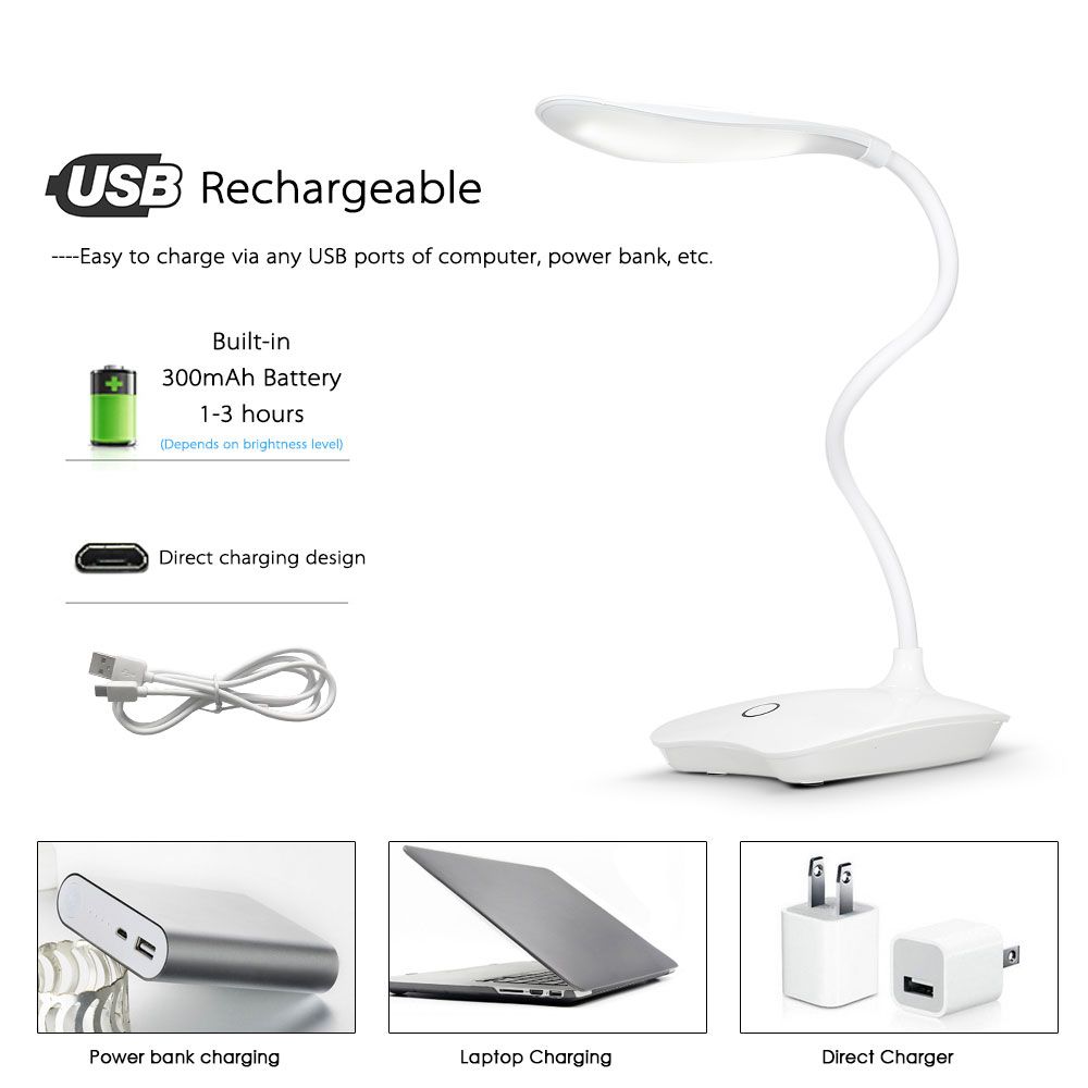 Ultralight desk lamp, USB rechargeable, with 3 levels of brightness adjustable, is portable for both indoor and outdoor use. Its flexible metal hose and 360° rotatable head provide all-around lighting. Adopting LED light source, no UV radiation, no flicker, no dazzle, no harm to your eyes.