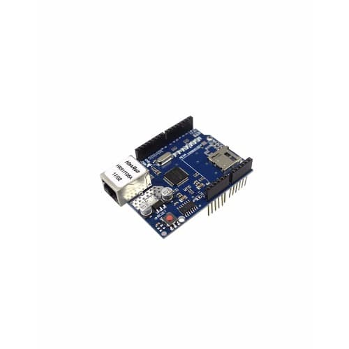 This Ethernet Shield which is based on the W5100 Ethernet Chip gives you an easy way to get your device Online. It is directly supported by official Ethernet Library. It adds a micro-SD card slot, which can be used to store files for serving over the network