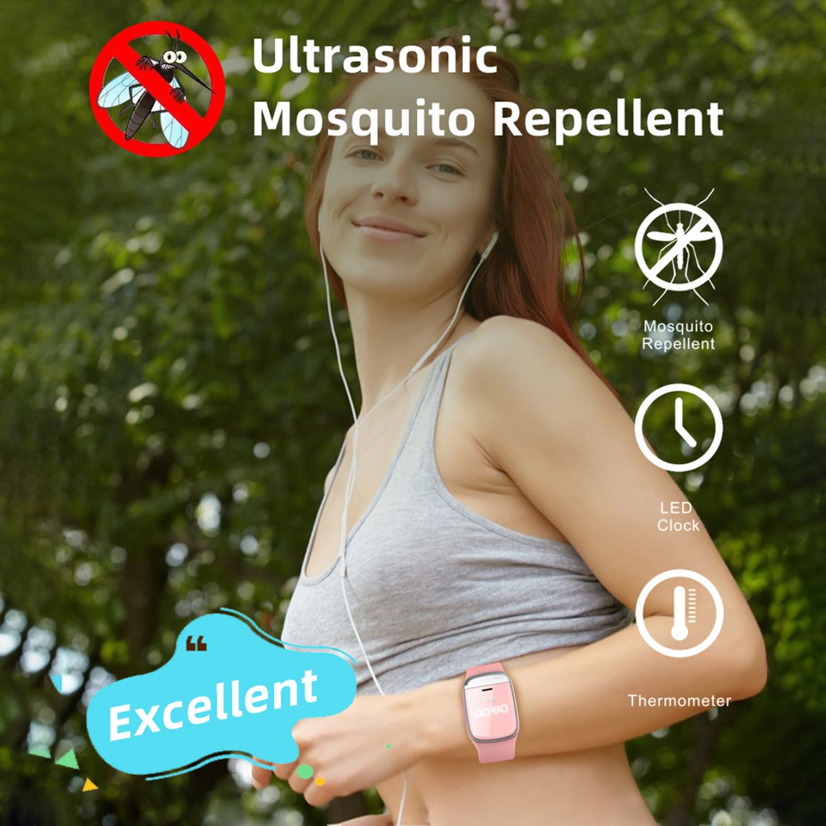 The watch is mosquito repellent, which can help you drive away the mosquitos while your are outside running or camping, very practical.