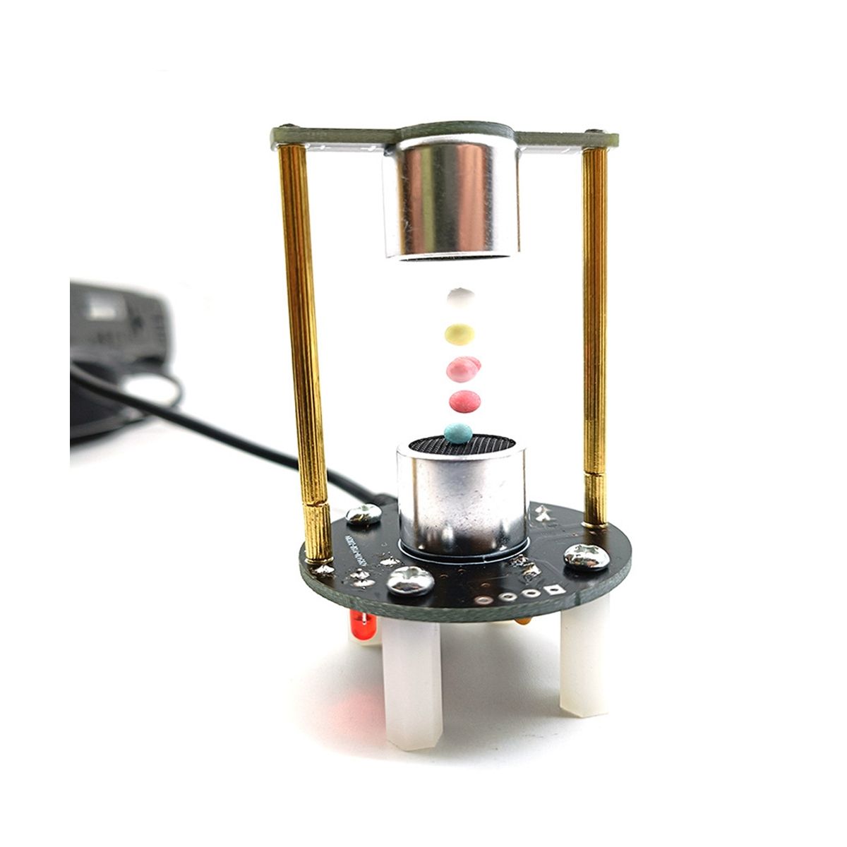 This suspension device runs at a frequency of 40KHZ in the air, which can capture light objects with a density diameter of 2-3MM, such as foam balls, ants and other tiny items in the air for a long time stable levitation, the main board slightly heats;